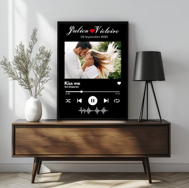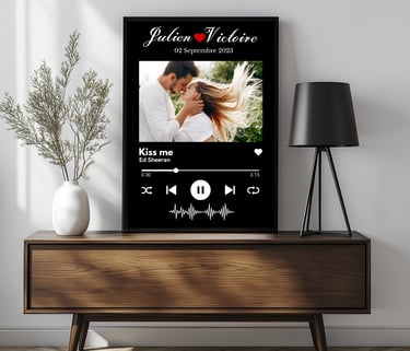 Que ce soit pour célébrer une histoire d’amour, un moment marquant ou simplement votre morceau coup de cœur, cette affiche apporte une touche musicale et moderne à votre décoration.