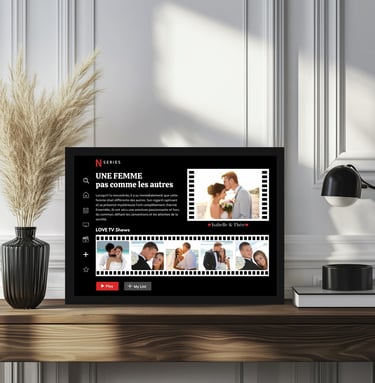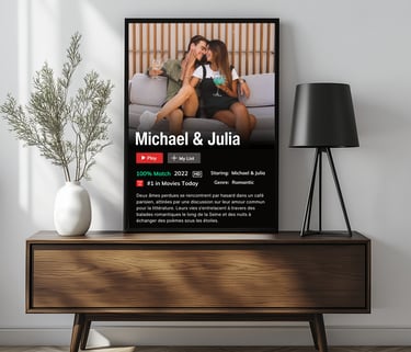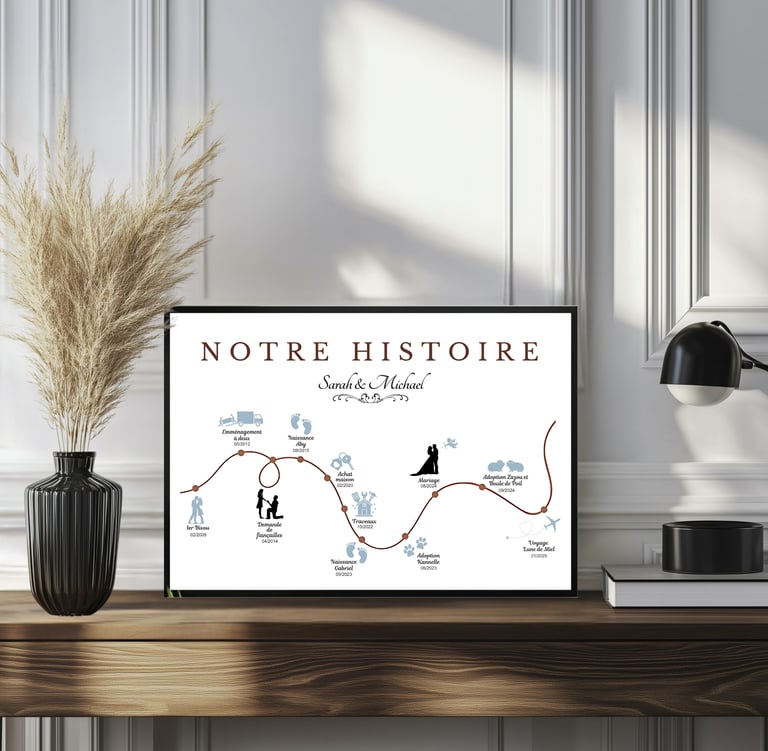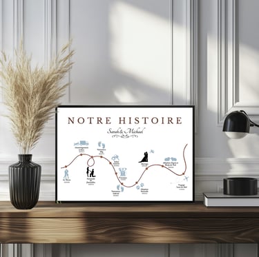 Notre affiche personnalisée "Histoire" immortalise ce voyage unique : la rencontre, les fous rires, les grandes décisions, le mariage, les enfants, ou encore la maison tant rêvée… Un souvenir intemporel qui raconte votre amour et tout ce qui l’a rendu si précieux.